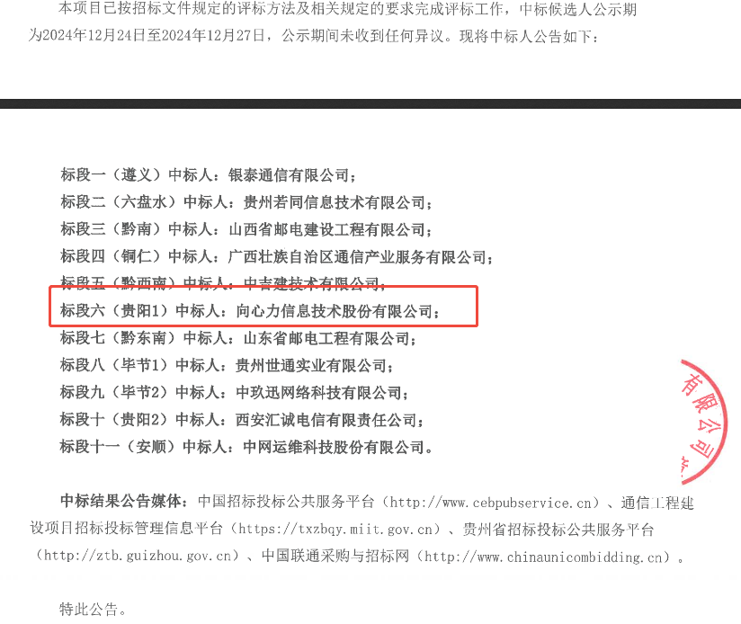 2024年12月底,2024-2026年貴州聯(lián)通政企客戶網(wǎng)絡(luò)工程項(xiàng)目施工單位采購(gòu)公布了中標(biāo)結(jié)果,向心力信息技術(shù)股份有限公司中標(biāo)標(biāo)段四,中標(biāo)金額1900萬(wàn)元(不含稅)。服務(wù)內(nèi)容主要包括政企客戶專線的新建擴(kuò)容、改造、零星整治等施工。