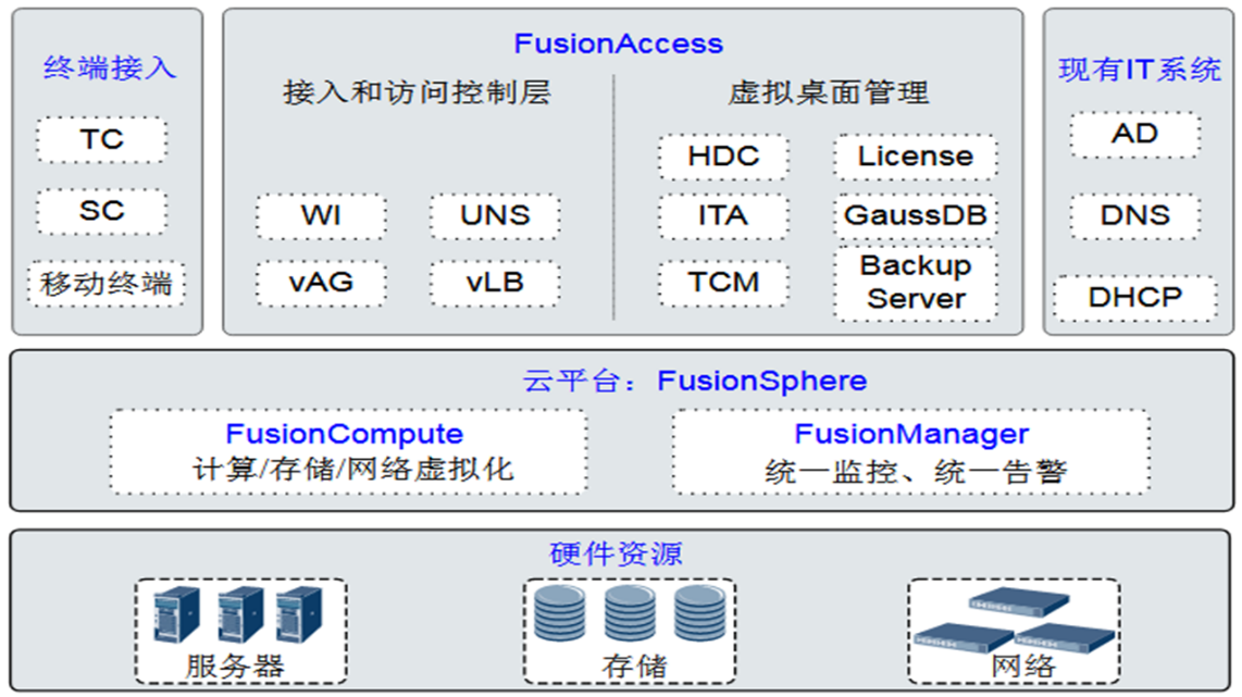 4.1采用華為的標(biāo)準(zhǔn)桌面云架構(gòu),由FusionAccess、FusionCompute、FusionManager管理軟件共同組成,F(xiàn)usionAccess:桌面云虛擬桌面的業(yè)務(wù)配置與發(fā)放,桌面云虛擬機(jī)的主要日常管理維護(hù)。FusionCompute:云操作系統(tǒng)軟件,主要負(fù)責(zé)硬件資源的虛擬化,以及對虛擬資源、業(yè)務(wù)資源、用戶資源的集中管理,基礎(chǔ)設(shè)施資源管理(主機(jī)/集群/存儲/網(wǎng)絡(luò)),用戶虛擬機(jī)模板制作。(4)桌面云虛擬機(jī)的部分維護(hù)操作(VNC登錄、手工遷移磁盤管理、快照備份)。FusionManager:主要對桌面云解決方案的軟件和硬件進(jìn)行全面的監(jiān)控和管理,軟硬件統(tǒng)一告警監(jiān)控。