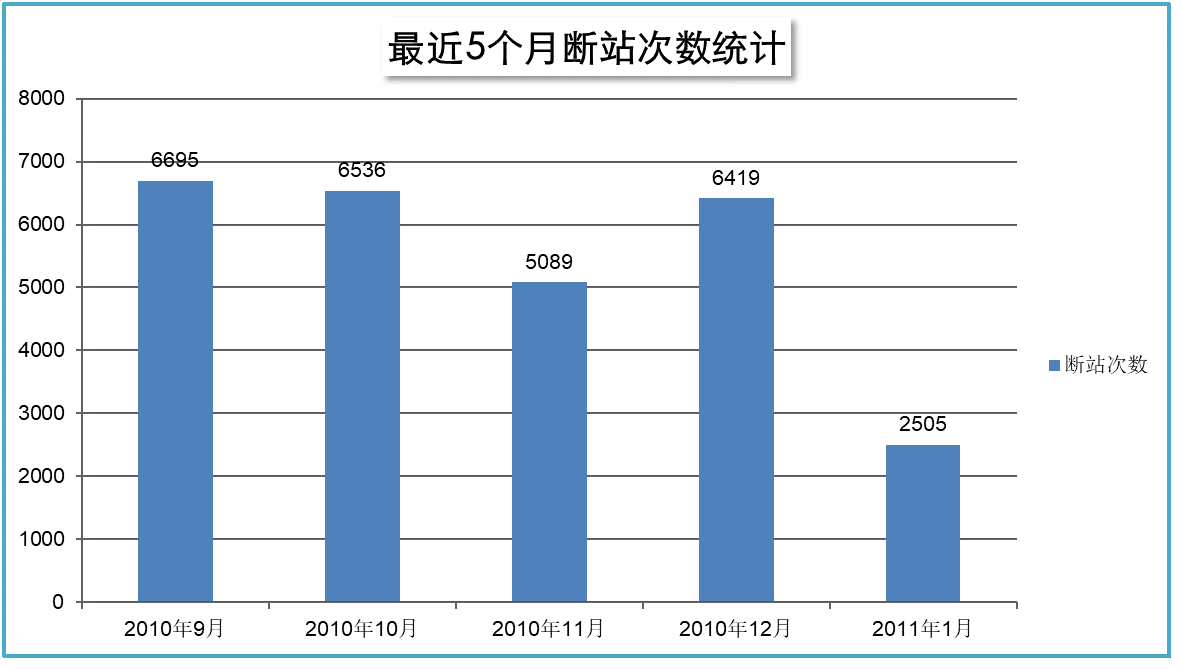 本次優(yōu)化效果十分明顯,每月的基站斷站次數(shù)有了明顯的下降。優(yōu)化前和優(yōu)化實施中前期的15年9-12月份4個月的平均月中斷次數(shù)為6185次,而優(yōu)化后期的16年1月份的月斷站次數(shù)已降至2505次。