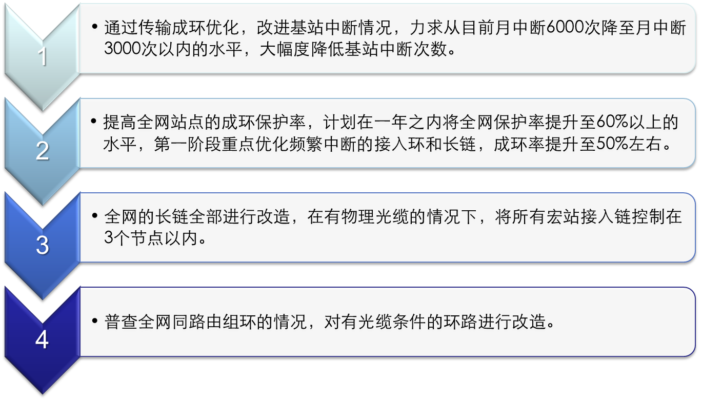 某地市運營商近年來,一直進行大規(guī)模的4G基站開通、工程建設(shè),到現(xiàn)在為止,全網(wǎng)傳輸節(jié)點已達3000余個,由于工程建設(shè)任務(wù)的迫切需求,一直沒有進行大規(guī)模的優(yōu)化工作,全網(wǎng)節(jié)點的安全性極差,導(dǎo)致基站中斷率居高不下,給分公司的網(wǎng)絡(luò)指標(biāo)考核工作帶來極大的壓力,為此急需啟動傳輸網(wǎng)絡(luò)優(yōu)化工作,降低基站中斷指標(biāo)。