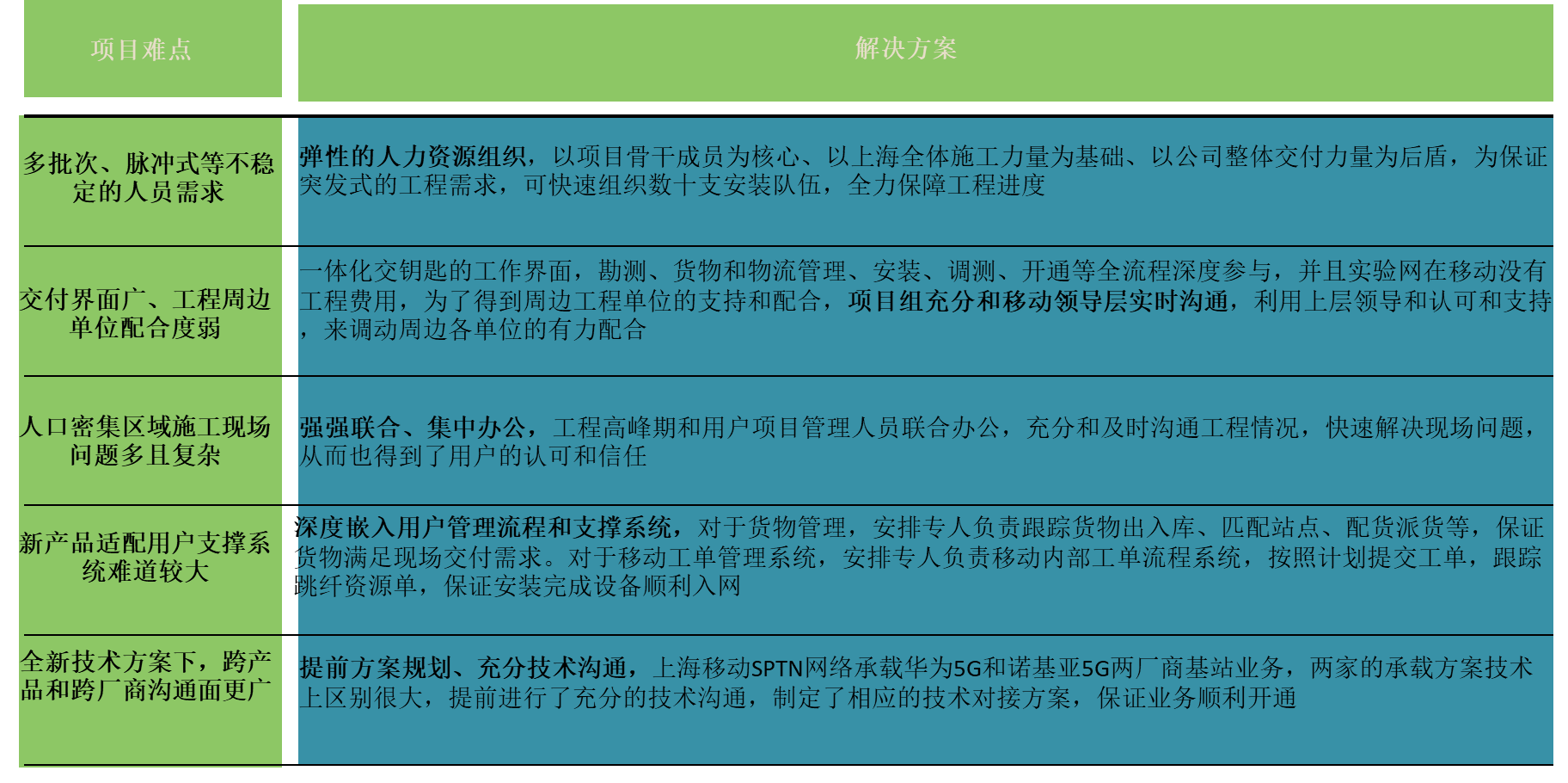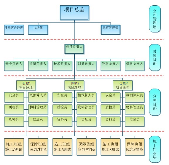 深度嵌入進華為項目組織結(jié)構(gòu)中,為本項目配置經(jīng)驗豐富的精干人員組成項目骨干團隊,同時還可以隨時抽調(diào)公司交付資源應(yīng)對突發(fā)工程需求,全力配合工程需求,保障某移動5G開通做為政治任務(wù)來完成!