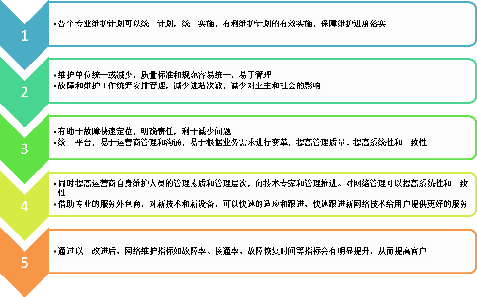 隨著近年4G網(wǎng)絡(luò)發(fā)展的深入和5G網(wǎng)絡(luò)建設(shè)的開始、網(wǎng)絡(luò)規(guī)模越來越大,承載業(yè)務(wù)數(shù)量越來越多,運營商建設(shè)和維護的壓力越來越大。網(wǎng)絡(luò)的日漸擴大和網(wǎng)絡(luò)管理維護人員不足的矛盾也越來越突出。目前在國際和國內(nèi)都逐步增加服務(wù)外包的背景下,運營商需要有優(yōu)秀的網(wǎng)絡(luò)服務(wù)商來支撐好本地的網(wǎng)絡(luò)維護和管理工作,將部分的網(wǎng)絡(luò)維護和管理工作外包,不失為一個很好的減員增效的策略。向心力作為一個專注通信網(wǎng)絡(luò)服務(wù)的專業(yè)服務(wù)外包商,愿意為運營商的網(wǎng)絡(luò)維護和管理做出更多更好的貢獻,提高運營商的核心競爭力。