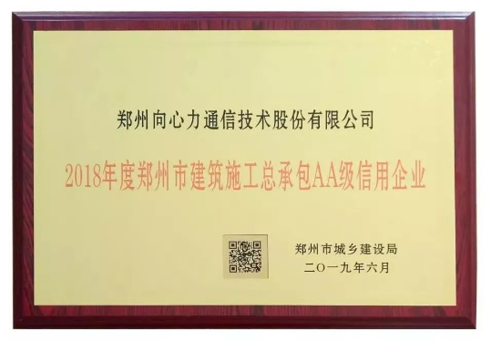 向心力公司被評為2018年度鄭州市建筑施工總承包AA級信用企業(yè)