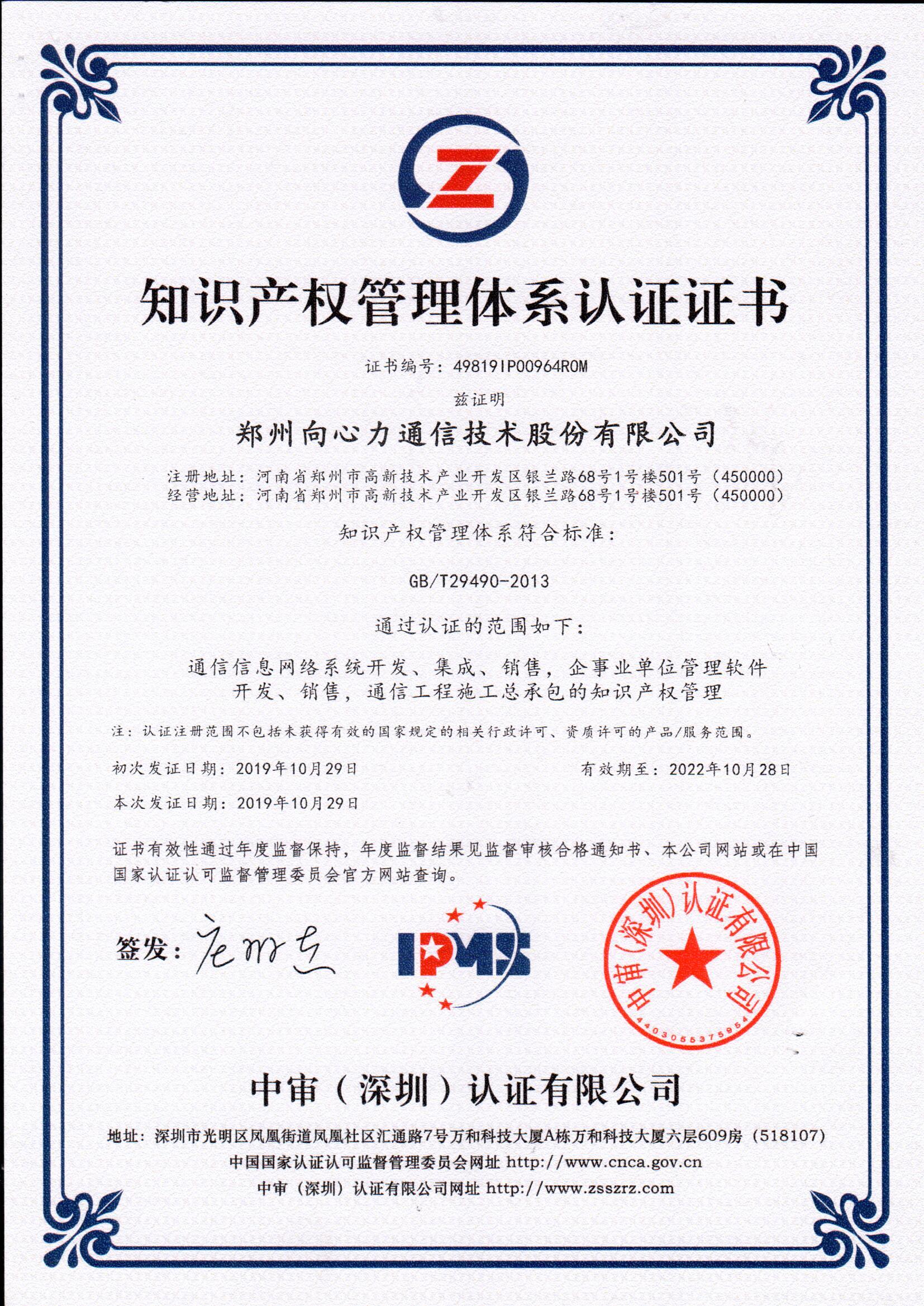 向心力公司取得國家知識(shí)產(chǎn)權(quán)管理體系認(rèn)證證書